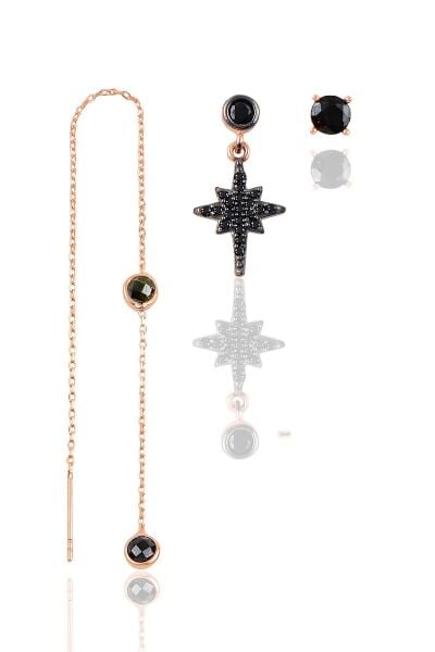 Gümüş rose onix taşlı kutup yıldızı kombin üçlü küpe seti SGTL11381SIYAH